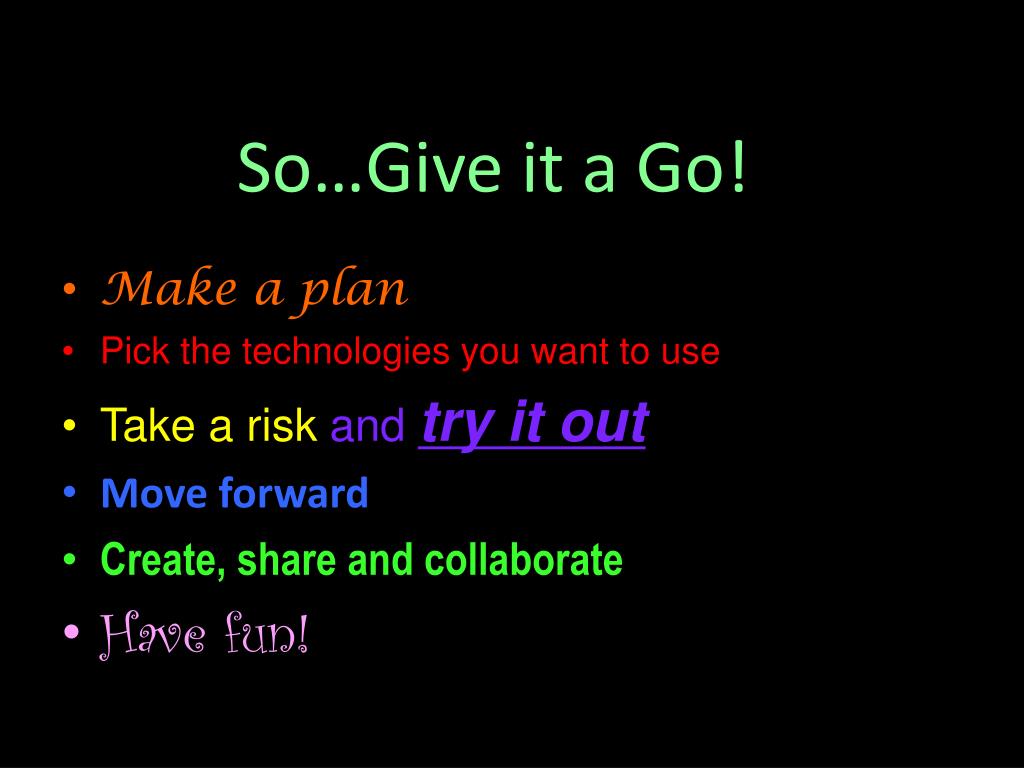So…Give it a Go! • Make a plan • Pick the technologies you want to use • Take a risk and try it out • Move forward • Create, share and collaborate • Have fun!