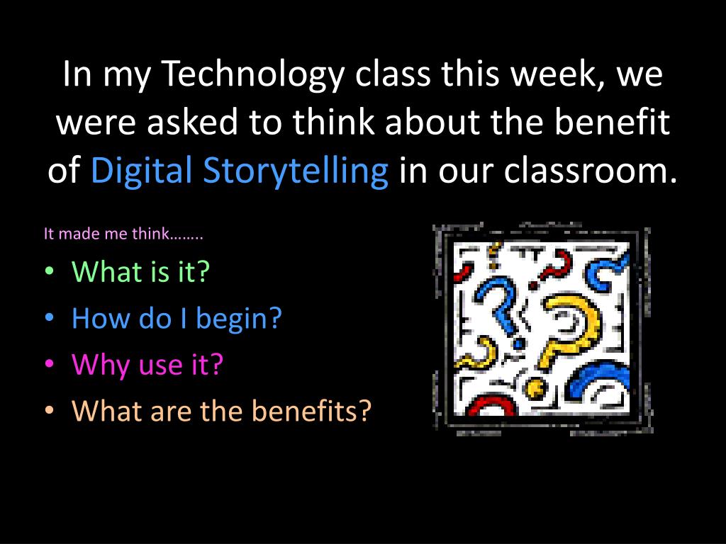 In my Technology class this week, we were asked to think about the benefit of Digital Storytelling in our classroom. • What is it? • How do I begin? • Why use it? • What are the benefits? It made me think……..