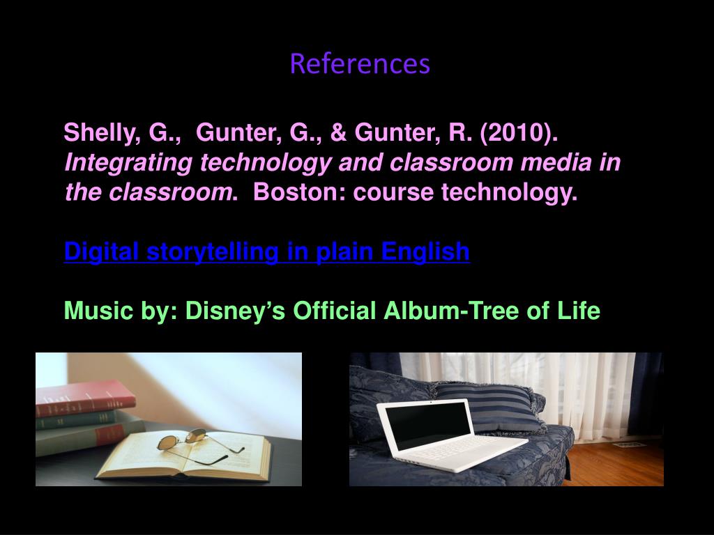 References Shelly, G., Gunter, G., & Gunter, R. (2010). Integrating technology and classroom media in the classroom. Boston: course technology.Digital storytelling in plain EnglishMusic by: Disney’s Official Album-Tree of Life