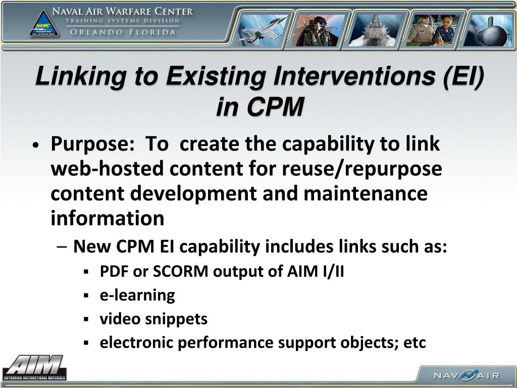 Linking to Existing Interventions (EI)in CPM • Purpose: To create the capability to link web-hosted content for reuse/repurpose content development and maintenance information • New CPM EI capability includes links such as: • PDF or SCORM output of AIM I/II • e-learning • video snippets • electronic performance support objects; etc