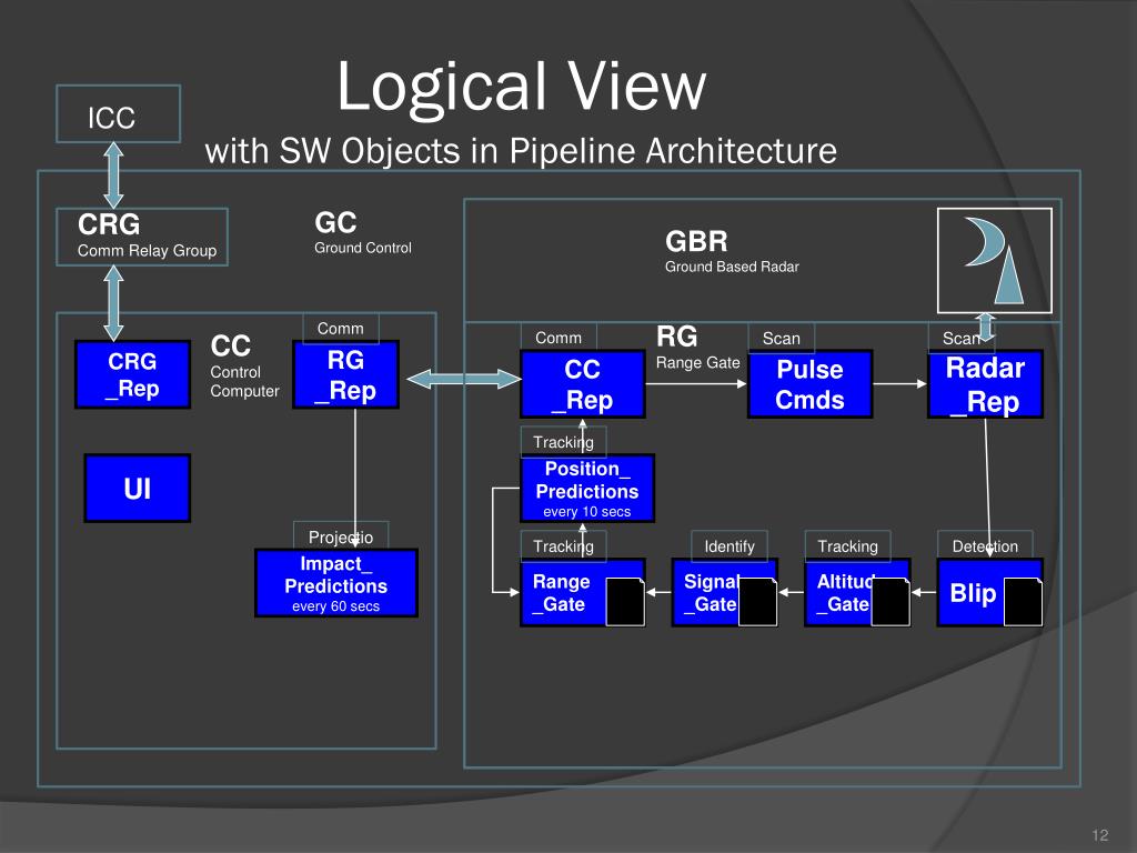 Logical Viewwith SW Objects in Pipeline Architecture ICC GCGround Control CRGComm Relay Group GBRGround Based Radar Comm RGRange Gate CCControl Computer Comm Scan Scan CRG_Rep RG_Rep CC_Rep PulseCmds Radar_Rep Tracking UI Position_Predictionsevery 10 secs Projection Tracking Identify Tracking Detection Impact_Predictions every 60 secs Range _Gate Signal _Gate Altitude _Gate Blip