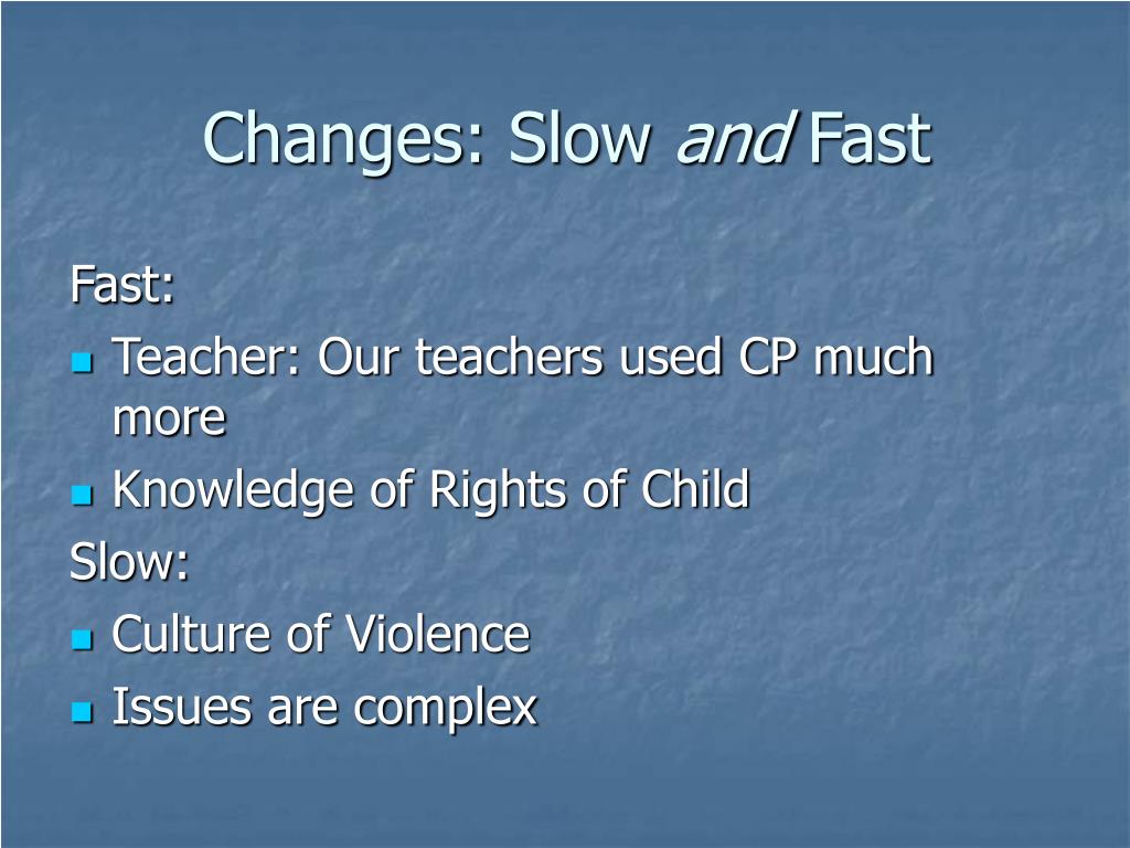 Changes: Slow and Fast Fast: • Teacher: Our teachers used CP much more • Knowledge of Rights of Child Slow: • Culture of Violence • Issues are complex