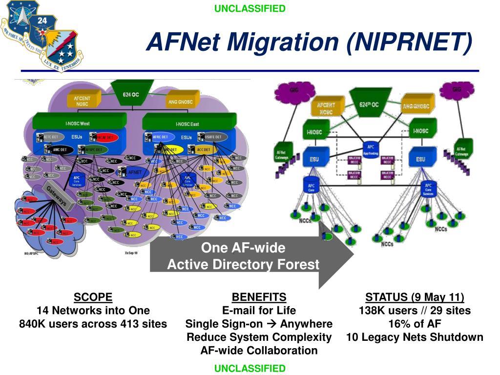 AFNet Migration (NIPRNET) One AF-wide Active Directory Forest SCOPE 14 Networks into One 840K users across 413 sites BENEFITS E-mail for Life Single Sign-on Anywhere Reduce System Complexity AF-wide Collaboration STATUS (9 May 11) 138K users // 29 sites 16% of AF 10 Legacy Nets Shutdown