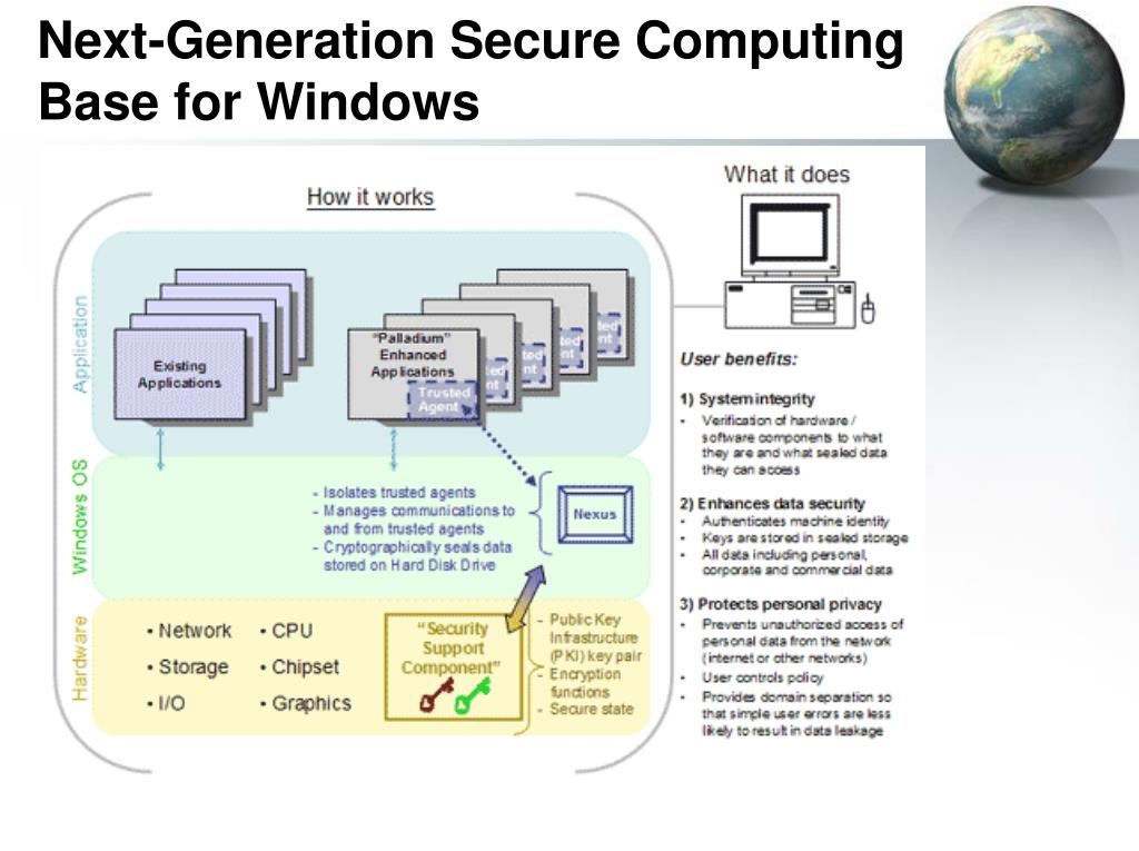 Software • Palladium - After the mythological statue that defended ancient Athens against invaders • Microsoft has discontinued use of the code name "Palladium." The new components being developed for the Microsoft® Windows® Operating System, are now referred to as the Next-Generation Secure Computing Base for Windows (NGSCB).