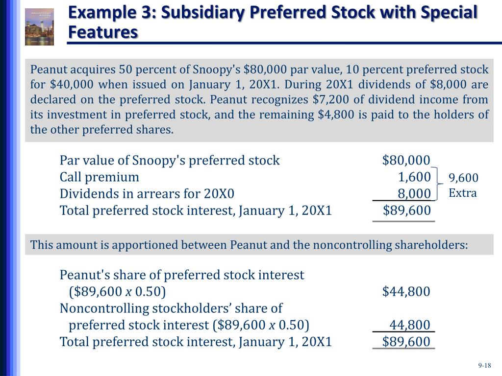 Example 3: Subsidiary Preferred Stock with Special Features Peanut acquires 50 percent of Snoopy's $80,000 par value, 10 percent preferred stock for $40,000 when issued on January 1, 20X1. During 20X1 dividends of $8,000 are declared on the preferred stock. Peanut recognizes $7,200 of dividend income from its investment in preferred stock, and the remaining $4,800 is paid to the holders of the other preferred shares. 9,600 Extra Par value of Snoopy's preferred stock $80,000) Call premium 1,600) Dividends in arrears for 20X0 8,000) Total preferred stock interest, January 1, 20X1 $89,600) Peanut's share of preferred stock interest ($89,600 x 0.50) $44,800) Noncontrolling stockholders’ share of preferred stock interest ($89,600 x 0.50) 44,800) Total preferred stock interest, January 1, 20X1 $89,600) This amount is apportioned between Peanut and the noncontrolling shareholders: