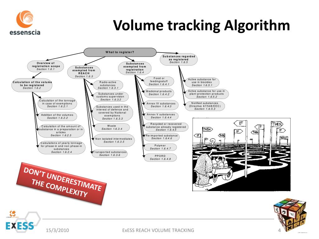 Why Volume tracking REACH Substance Volume tracking and detection of SVHC are important to : be compliant with the correct REACH regulation aspects track changes monthly as production quantities and companies LE and structure are subject of change control the tonnage bands to avoid extra new registration and analysis costs Automation is required for companies with an important number of (changing) chemicals and sites. ExESS REACH VOLUME TRACKING