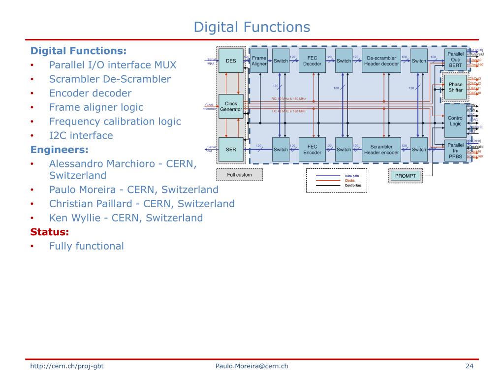 Digital Functions Digital Functions: • Parallel I/O interface MUX • Scrambler De-Scrambler • Encoder decoder • Frame aligner logic • Frequency calibration logic • I2C interface Engineers: • Alessandro Marchioro - CERN, Switzerland • Paulo Moreira - CERN, Switzerland • Christian Paillard - CERN, Switzerland • Ken Wyllie - CERN, Switzerland Status: • Fully functional Paulo.Moreira@cern.ch