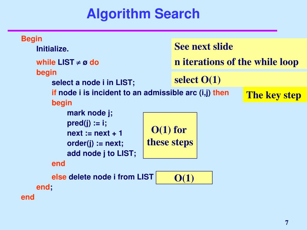 Algorithm Search • Begin • Initialize. • while LIST ø do • begin • select a node i in LIST; • if node i is incident to an admissible arc (i,j) then • begin • mark node j; • pred(j) := i; • next := next + 1 • order(j) := next; • add node j to LIST; • end • else delete node i from LIST • end; • end See next slide n iterations of the while loop select O(1) The key step O(1) for these steps O(1)