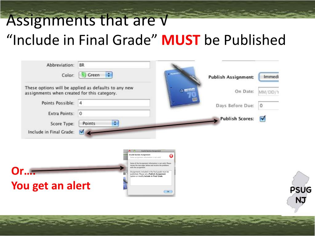 Assignments that are √“Include in Final Grade” MUST be Published Or…. You get an alert