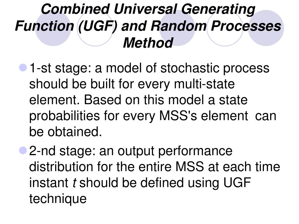 Combined Universal Generating Function (UGF) and Random Processes Method • 1-st stage: a model of stochastic process should be built for every multi-state element. Based on this model a state probabilities for every MSS's element can be obtained. • 2-nd stage: an output performance distribution for the entire MSS at each time instant t should be defined using UGF technique