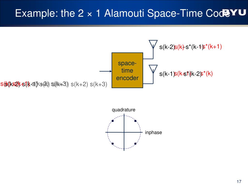 space-time encoder Example: the 2 × 1 Alamouti Space-Time Code s*(k-1) s(k-2) s(k-1) s*(k-2) s(k-2) s(k-1) s(k) s(k+1) s(k+2) s(k+3) quadrature inphase