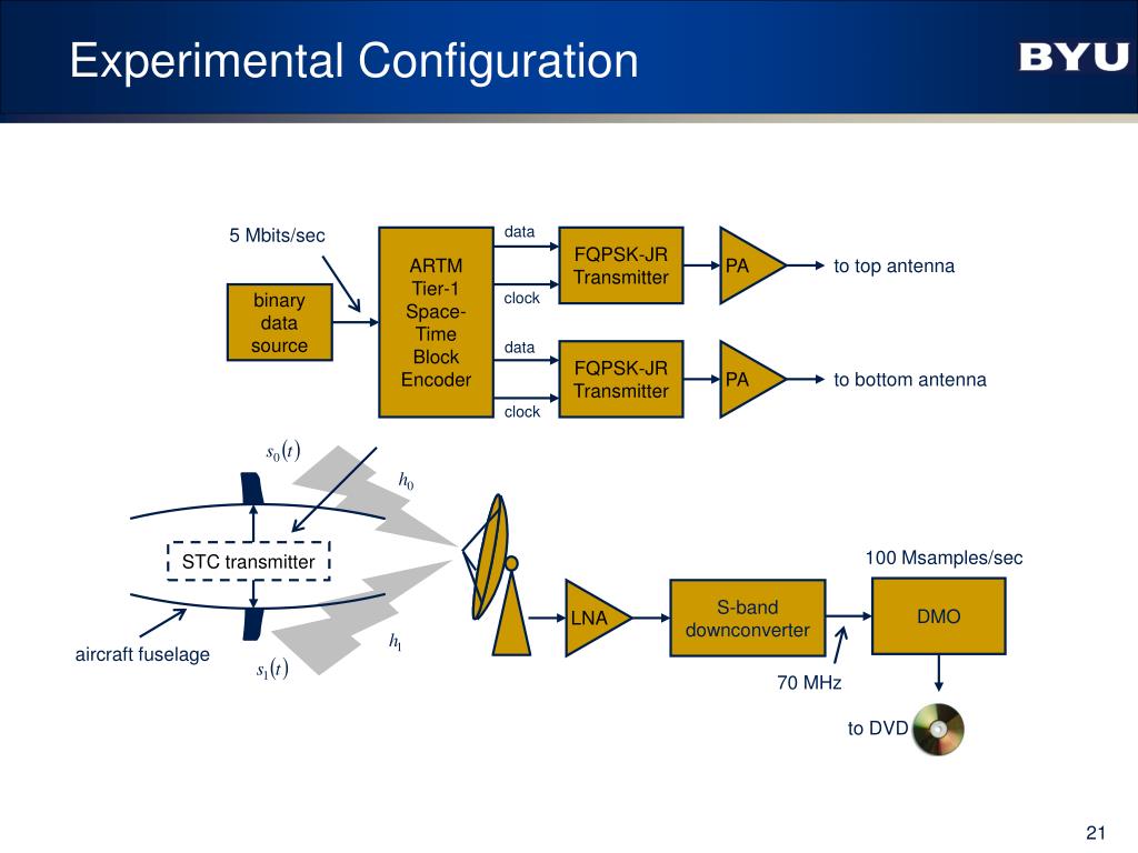 Experimental Configuration data 5 Mbits/sec ARTM Tier-1 Space-Time Block Encoder FQPSK-JR Transmitter PA to top antenna clock binary data source data FQPSK-JR Transmitter PA to bottom antenna clock 100 Msamples/sec STC transmitter DMO S-band downconverter LNA aircraft fuselage 70 MHz to DVD