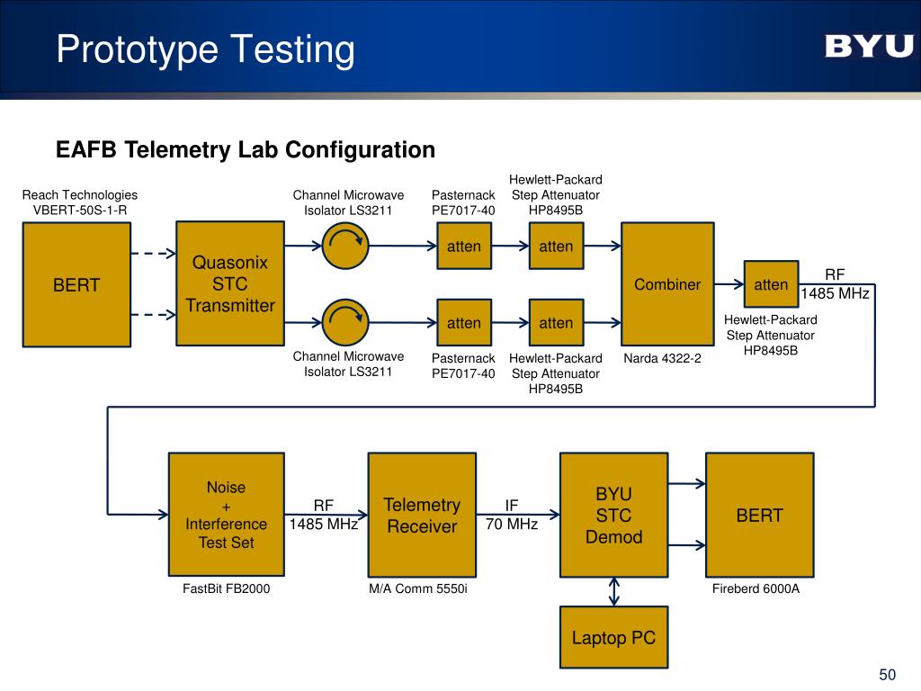 Prototype Testing EAFB Telemetry Lab Configuration Hewlett-Packard Step Attenuator HP8495B Reach Technologies VBERT-50S-1-R Channel Microwave Isolator LS3211 Pasternack PE7017-40 Quasonix STC Transmitter BERT atten atten Combiner RF 1485 MHz atten atten atten Hewlett-Packard Step Attenuator HP8495B Channel Microwave Isolator LS3211 Pasternack PE7017-40 Hewlett-Packard Step Attenuator HP8495B Narda 4322-2 Noise + Interference Test Set Telemetry Receiver BYU STC Demod BERT RF 1485 MHz IF 70 MHz FastBit FB2000 M/A Comm 5550i Fireberd 6000A Laptop PC