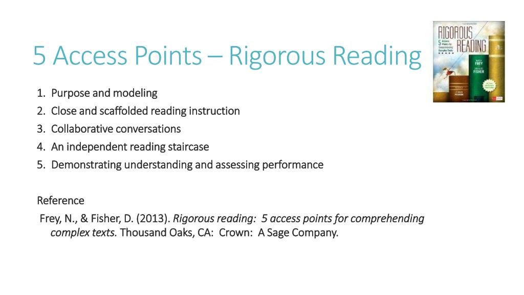5 Access Points – Rigorous Reading • 1. Purpose and modeling • 2. Close and scaffolded reading instruction • 3. Collaborative conversations • 4. An independent reading staircase • 5. Demonstrating understanding and assessing performance • Reference • Frey, N., & Fisher, D. (2013). Rigorous reading: 5 access points for comprehending • complex texts. Thousand Oaks, CA: Crown: A Sage Company.