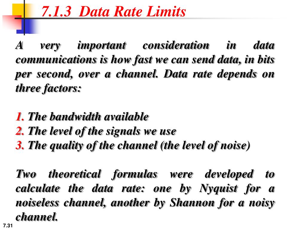 7.1.3 Data Rate Limits A very important consideration in data communications is how fast we can send data, in bits per second, over a channel. Data rate depends on three factors: 1. The bandwidth available 2. The level of the signals we use 3. The quality of the channel (the level of noise) Two theoretical formulas were developed to calculate the data rate: one by Nyquist for a noiseless channel, another by Shannon for a noisy channel.