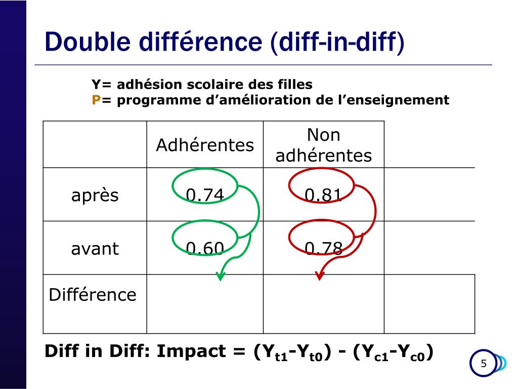 Double différence (diff-in-diff) Y= adhésion scolaire des filles P= programme d’amélioration de l’enseignement Différence Diff in Diff: Impact = (Yt1-Yt0) - (Yc1-Yc0)