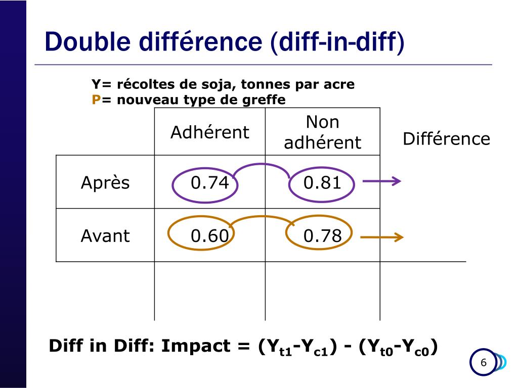 Double différence (diff-in-diff) Y= récoltes de soja, tonnes par acre P= nouveau type de greffe Différence Diff in Diff: Impact = (Yt1-Yc1) - (Yt0-Yc0)