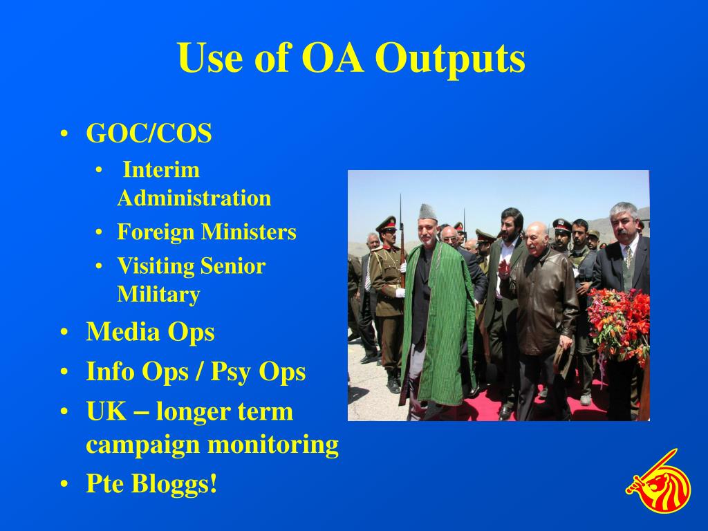 Use of OA Outputs • GOC/COS • Interim Administration • Foreign Ministers • Visiting Senior Military • Media Ops • Info Ops / Psy Ops • UK – longer term campaign monitoring • Pte Bloggs!