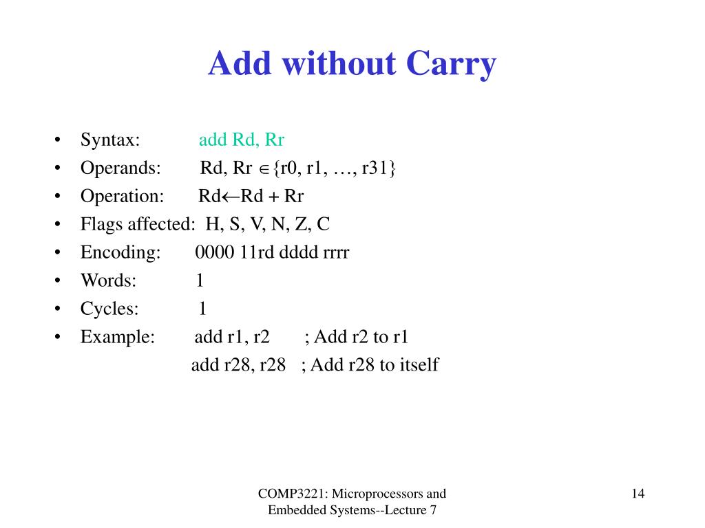 Add without Carry • Syntax: add Rd, Rr • Operands: Rd, Rr {r0, r1, …, r31} • Operation: RdRd + Rr • Flags affected: H, S, V, N, Z, C • Encoding: 0000 11rd dddd rrrr • Words: 1 • Cycles: 1 • Example: add r1, r2 ; Add r2 to r1 add r28, r28 ; Add r28 to itself COMP3221: Microprocessors and Embedded Systems--Lecture 7