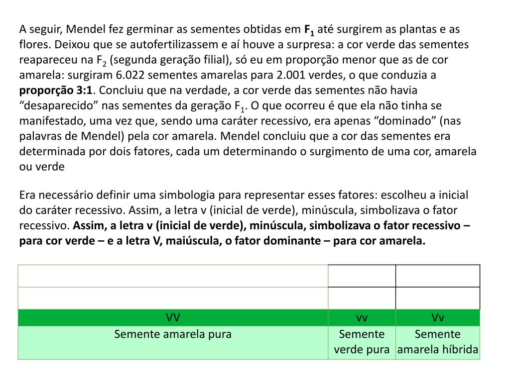 A seguir, Mendel fez germinar as sementes obtidas em F1 até surgirem as plantas e as flores. Deixou que se autofertilizassem e aí houve a surpresa: a cor verde das sementes reapareceu na F2 (segunda geração filial), só eu em proporção menor que as de cor amarela: surgiram 6.022 sementes amarelas para 2.001 verdes, o que conduzia a proporção 3:1. Concluiu que na verdade, a cor verde das sementes não havia “desaparecido” nas sementes da geração F1. O que ocorreu é que ela não tinha se manifestado, uma vez que, sendo uma caráter recessivo, era apenas “dominado” (nas palavras de Mendel) pela cor amarela. Mendel concluiu que a cor das sementes era determinada por dois fatores, cada um determinando o surgimento de uma cor, amarela ou verde Era necessário definir uma simbologia para representar esses fatores: escolheu a inicial do caráter recessivo. Assim, a letra v (inicial de verde), minúscula, simbolizava o fator recessivo. Assim, a letra v (inicial de verde), minúscula, simbolizava o fator recessivo – para cor verde – e a letra V, maiúscula, o fator dominante – para cor amarela.