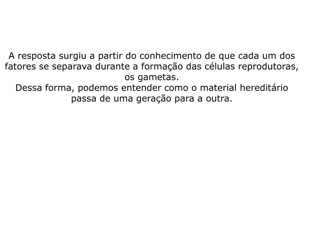 A resposta surgiu a partir do conhecimento de que cada um dos fatores se separava durante a formação das células reprodutoras, os gametas. Dessa forma, podemos entender como o material hereditário passa de uma geração para a outra.