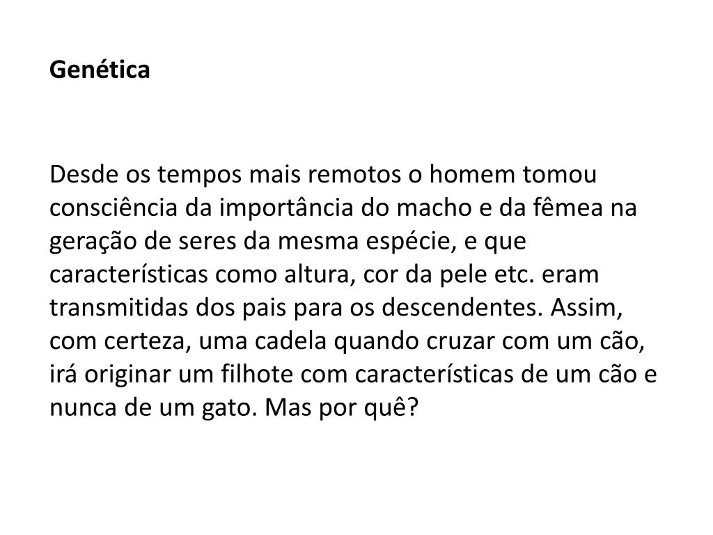 Genética Desde os tempos mais remotos o homem tomou consciência da importância do macho e da fêmea na geração de seres da mesma espécie, e que características como altura, cor da pele etc. eram transmitidas dos pais para os descendentes. Assim, com certeza, uma cadela quando cruzar com um cão, irá originar um filhote com características de um cão e nunca de um gato. Mas por quê?