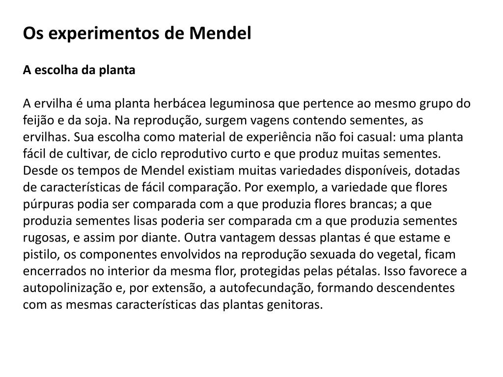 Os experimentos de Mendel A escolha da planta A ervilha é uma planta herbácea leguminosa que pertence ao mesmo grupo do feijão e da soja. Na reprodução, surgem vagens contendo sementes, as ervilhas. Sua escolha como material de experiência não foi casual: uma planta fácil de cultivar, de ciclo reprodutivo curto e que produz muitas sementes. Desde os tempos de Mendel existiam muitas variedades disponíveis, dotadas de características de fácil comparação. Por exemplo, a variedade que flores púrpuras podia ser comparada com a que produzia flores brancas; a que produzia sementes lisas poderia ser comparada cm a que produzia sementes rugosas, e assim por diante. Outra vantagem dessas plantas é que estame e pistilo, os componentes envolvidos na reprodução sexuada do vegetal, ficam encerrados no interior da mesma flor, protegidas pelas pétalas. Isso favorece a autopolinização e, por extensão, a autofecundação, formando descendentes com as mesmas características das plantas genitoras.