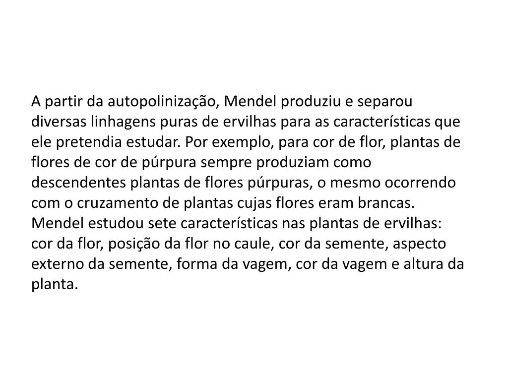 A partir da autopolinização, Mendel produziu e separou diversas linhagens puras de ervilhas para as características que ele pretendia estudar. Por exemplo, para cor de flor, plantas de flores de cor de púrpura sempre produziam como descendentes plantas de flores púrpuras, o mesmo ocorrendo com o cruzamento de plantas cujas flores eram brancas. Mendel estudou sete características nas plantas de ervilhas: cor da flor, posição da flor no caule, cor da semente, aspecto externo da semente, forma da vagem, cor da vagem e altura da planta.