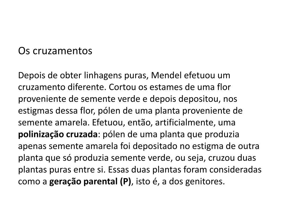 Os cruzamentos Depois de obter linhagens puras, Mendel efetuou um cruzamento diferente. Cortou os estames de uma flor proveniente de semente verde e depois depositou, nos estigmas dessa flor, pólen de uma planta proveniente de semente amarela. Efetuou, então, artificialmente, uma polinização cruzada: pólen de uma planta que produzia apenas semente amarela foi depositado no estigma de outra planta que só produzia semente verde, ou seja, cruzou duas plantas puras entre si. Essas duas plantas foram consideradas como a geração parental (P), isto é, a dos genitores.