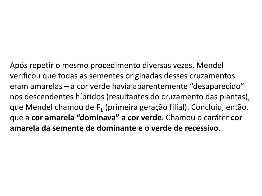 Após repetir o mesmo procedimento diversas vezes, Mendel verificou que todas as sementes originadas desses cruzamentos eram amarelas – a cor verde havia aparentemente “desaparecido” nos descendentes híbridos (resultantes do cruzamento das plantas), que Mendel chamou de F1 (primeira geração filial). Concluiu, então, que a cor amarela “dominava” a cor verde. Chamou o caráter cor amarela da semente de dominante e o verde de recessivo.