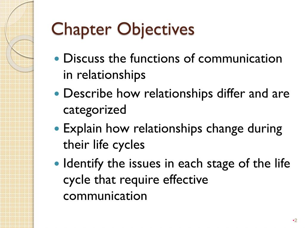 Chapter Objectives • Discuss the functions of communication in relationships • Describe how relationships differ and are categorized • Explain how relationships change during their life cycles • Identify the issues in each stage of the life cycle that require effective communication