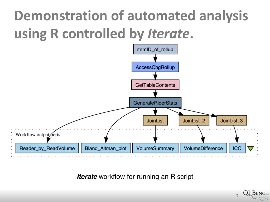 Demonstration of automated analysis using R controlled by Iterate. Iterate workflow for running an R script 7 7 7 7 7 7