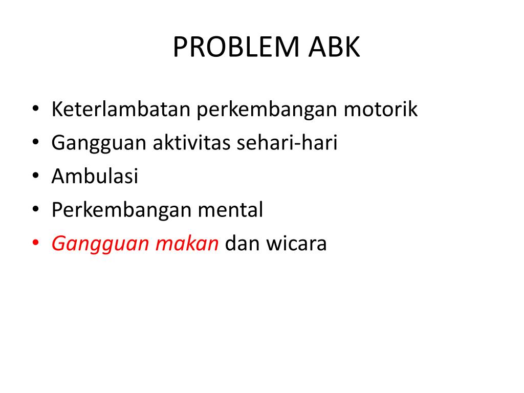 PROBLEM ABK • Keterlambatanperkembanganmotorik • Gangguanaktivitassehari-hari • Ambulasi • Perkembangan mental • Gangguanmakandanwicara