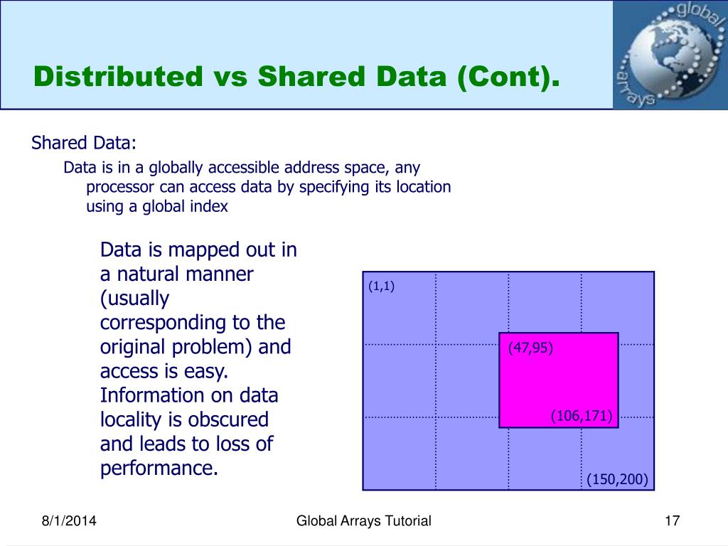 Distributed vs Shared Data (Cont). Shared Data: Data is in a globally accessible address space, any processor can access data by specifying its location using a global index Data is mapped out in a natural manner (usually corresponding to the original problem) and access is easy. Information on data locality is obscured and leads to loss of performance. (1,1) (47,95) (106,171) (150,200) Global Arrays Tutorial