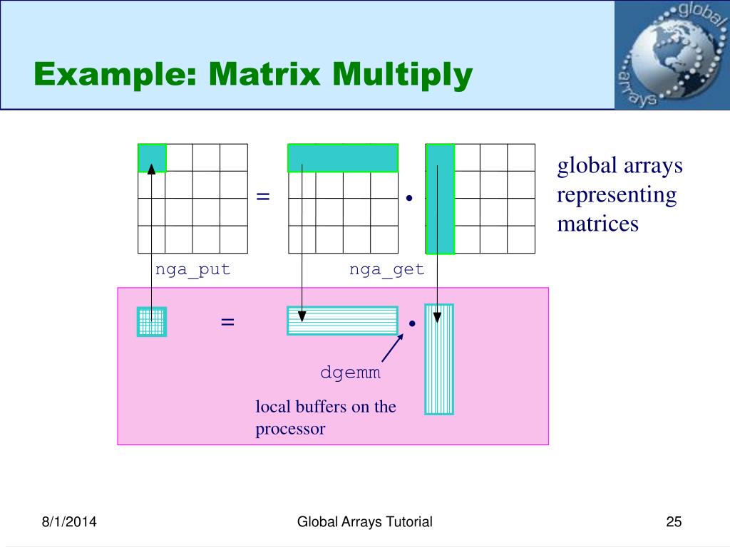 Example: Matrix Multiply global arrays representing matrices = • nga_put nga_get = • dgemm local buffers on the processor Global Arrays Tutorial