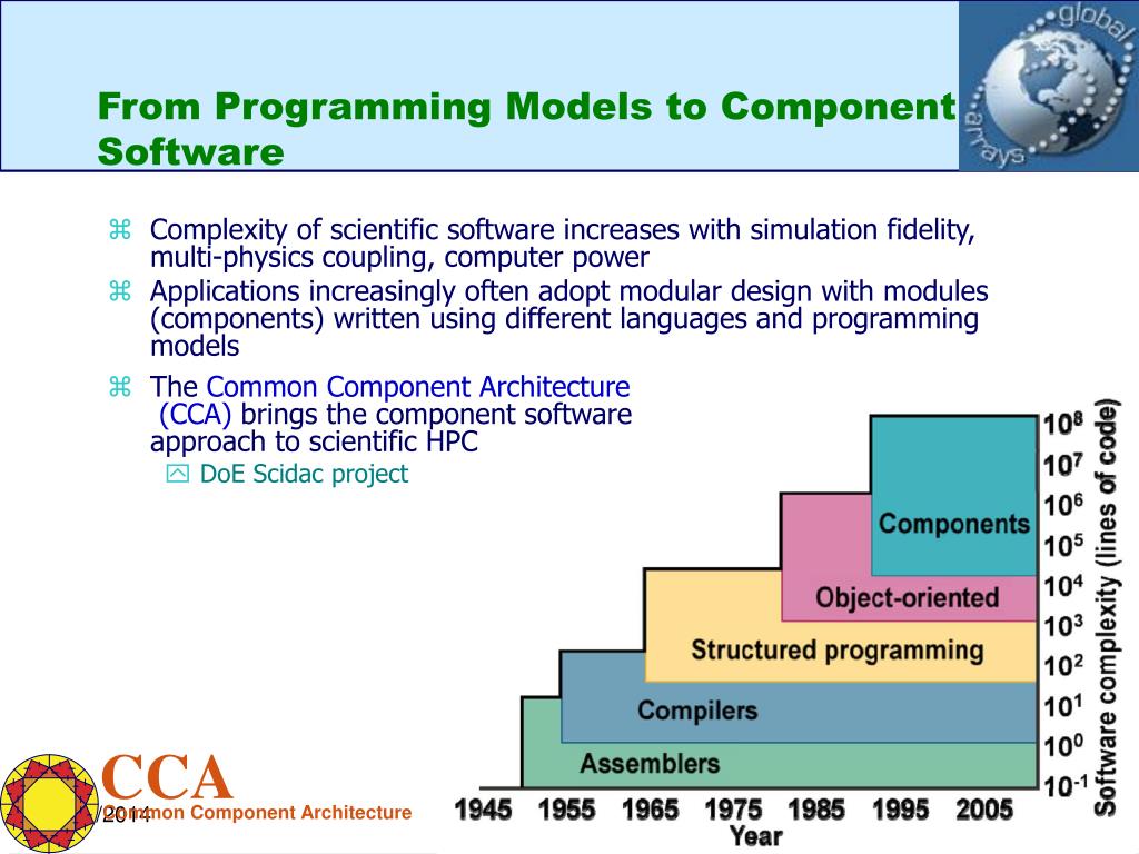 CCA Common Component Architecture From Programming Models to Component Software • Complexity of scientific software increases with simulation fidelity, multi-physics coupling, computer power • Applications increasingly often adopt modular design with modules (components) written using different languages and programming models • The Common Component Architecture (CCA) brings the component software approach to scientific HPC • DoE Scidac project Global Arrays Tutorial