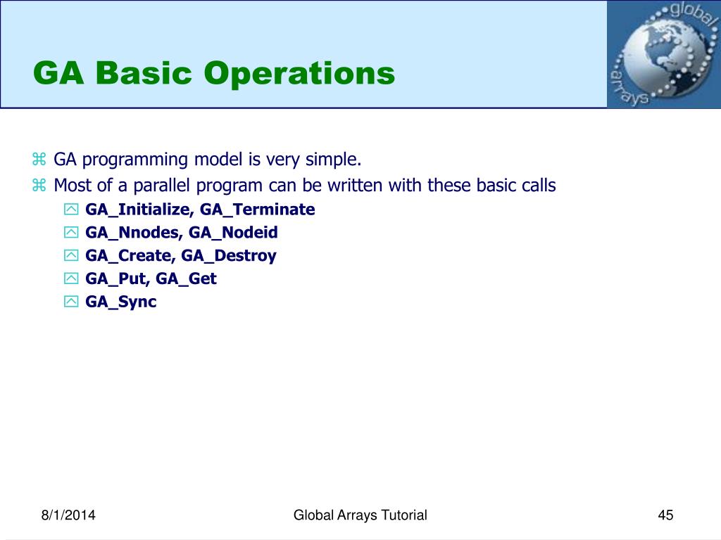 GA Basic Operations • GA programming model is very simple. • Most of a parallel program can be written with these basic calls • GA_Initialize, GA_Terminate • GA_Nnodes, GA_Nodeid • GA_Create, GA_Destroy • GA_Put, GA_Get • GA_Sync Global Arrays Tutorial