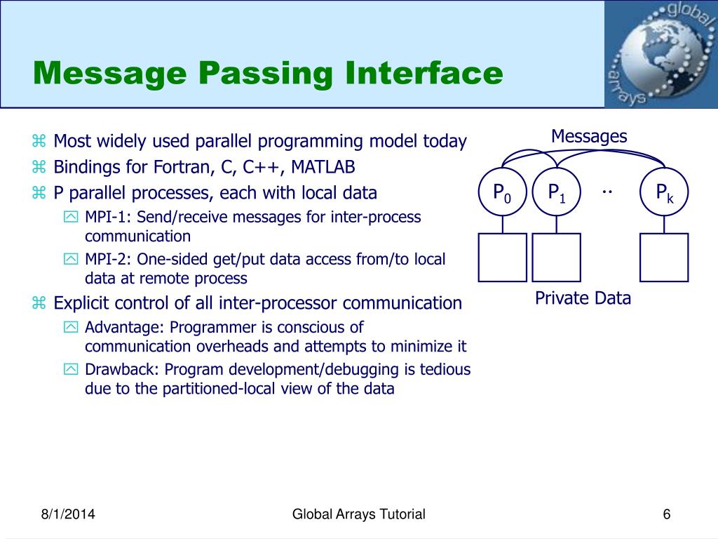 Message Passing Interface Messages • Most widely used parallel programming model today • Bindings for Fortran, C, C++, MATLAB • P parallel processes, each with local data • MPI-1: Send/receive messages for inter-process communication • MPI-2: One-sided get/put data access from/to local data at remote process • Explicit control of all inter-processor communication • Advantage: Programmer is conscious of communication overheads and attempts to minimize it • Drawback: Program development/debugging is tedious due to the partitioned-local view of the data P0 P1 Pk Private Data Global Arrays Tutorial