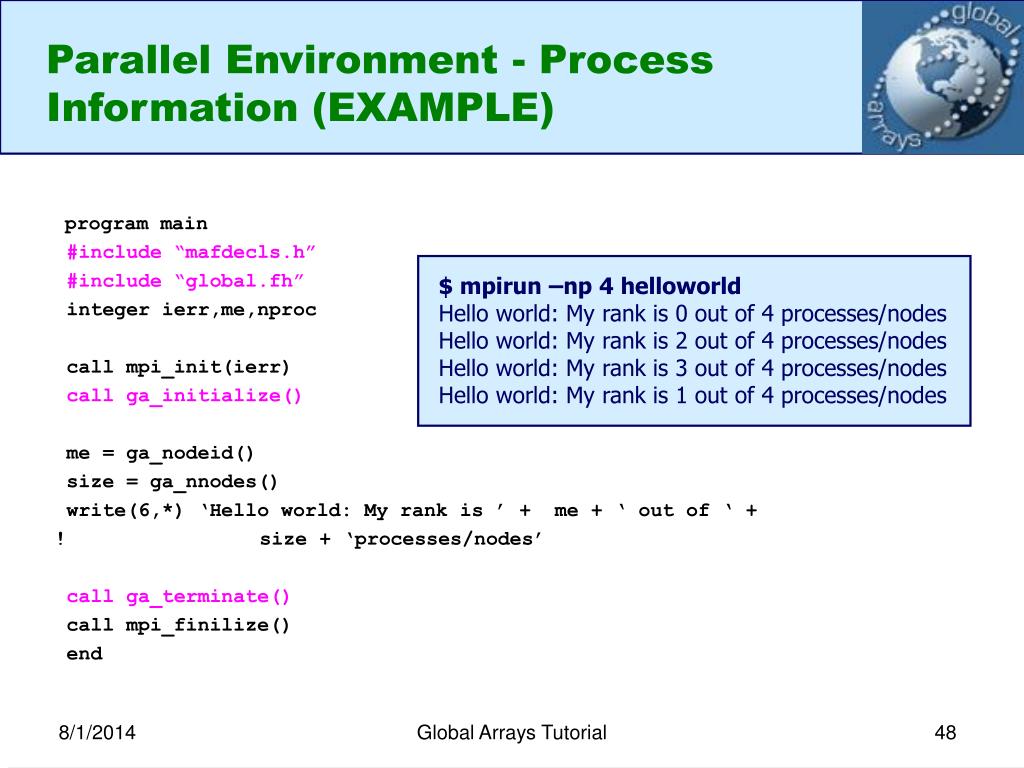 Parallel Environment - Process Information (EXAMPLE) program main #include “mafdecls.h” #include “global.fh” integer ierr,me,nproc call mpi_init(ierr) call ga_initialize() me = ga_nodeid() size = ga_nnodes() write(6,*) ‘Hello world: My rank is ’ + me + ‘ out of ‘ + ! size + ‘processes/nodes’ call ga_terminate() call mpi_finilize() end $ mpirun –np 4 helloworld Hello world: My rank is 0 out of 4 processes/nodes Hello world: My rank is 2 out of 4 processes/nodes Hello world: My rank is 3 out of 4 processes/nodes Hello world: My rank is 1 out of 4 processes/nodes Global Arrays Tutorial