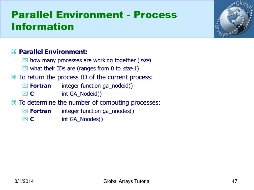 Parallel Environment - Process Information • Parallel Environment: • how many processes are working together (size) • what their IDs are (ranges from 0 to size-1) • To return the process ID of the current process: • Fortran integer function ga_nodeid() • C int GA_Nodeid() • To determine the number of computing processes: • Fortran integer function ga_nnodes() • C int GA_Nnodes() Global Arrays Tutorial