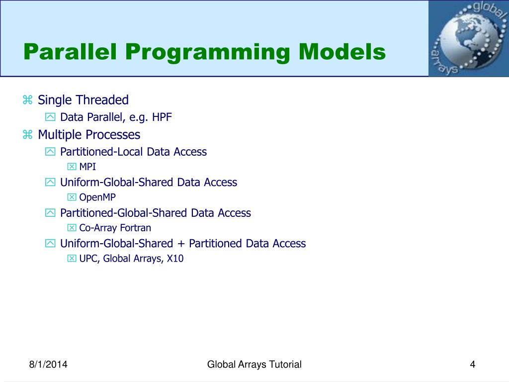 Parallel Programming Models • Single Threaded • Data Parallel, e.g. HPF • Multiple Processes • Partitioned-Local Data Access • MPI • Uniform-Global-Shared Data Access • OpenMP • Partitioned-Global-Shared Data Access • Co-Array Fortran • Uniform-Global-Shared + Partitioned Data Access • UPC, Global Arrays, X10 Global Arrays Tutorial