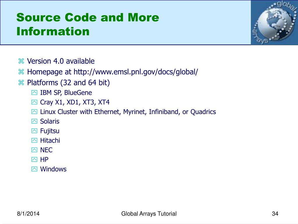 Source Code and MoreInformation • Version 4.0 available • Homepage at http://www.emsl.pnl.gov/docs/global/ • Platforms (32 and 64 bit) • IBM SP, BlueGene • Cray X1, XD1, XT3, XT4 • Linux Cluster with Ethernet, Myrinet, Infiniband, or Quadrics • Solaris • Fujitsu • Hitachi • NEC • HP • Windows Global Arrays Tutorial