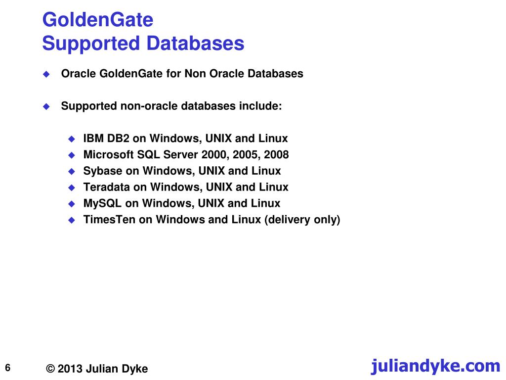 GoldenGate Supported Databases • Oracle GoldenGate for Non Oracle Databases • Supported non-oracle databases include: • IBM DB2 on Windows, UNIX and Linux • Microsoft SQL Server 2000, 2005, 2008 • Sybase on Windows, UNIX and Linux • Teradata on Windows, UNIX and Linux • MySQL on Windows, UNIX and Linux • TimesTen on Windows and Linux (delivery only)