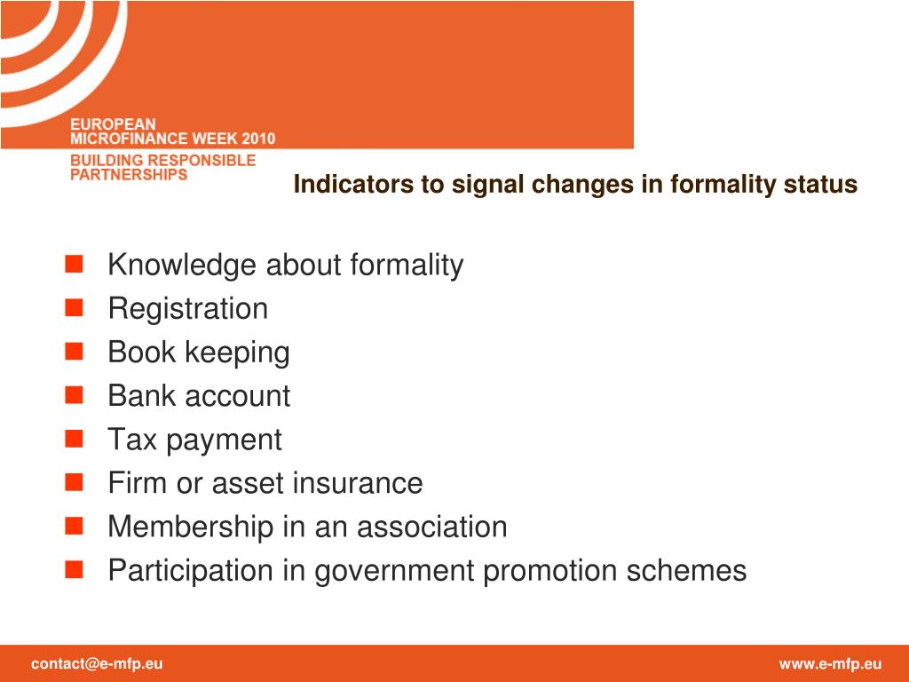 Indicators to signal changes in formality status • Knowledge about formality • Registration • Book keeping • Bank account • Tax payment • Firm or asset insurance • Membership in an association • Participation in government promotion schemes