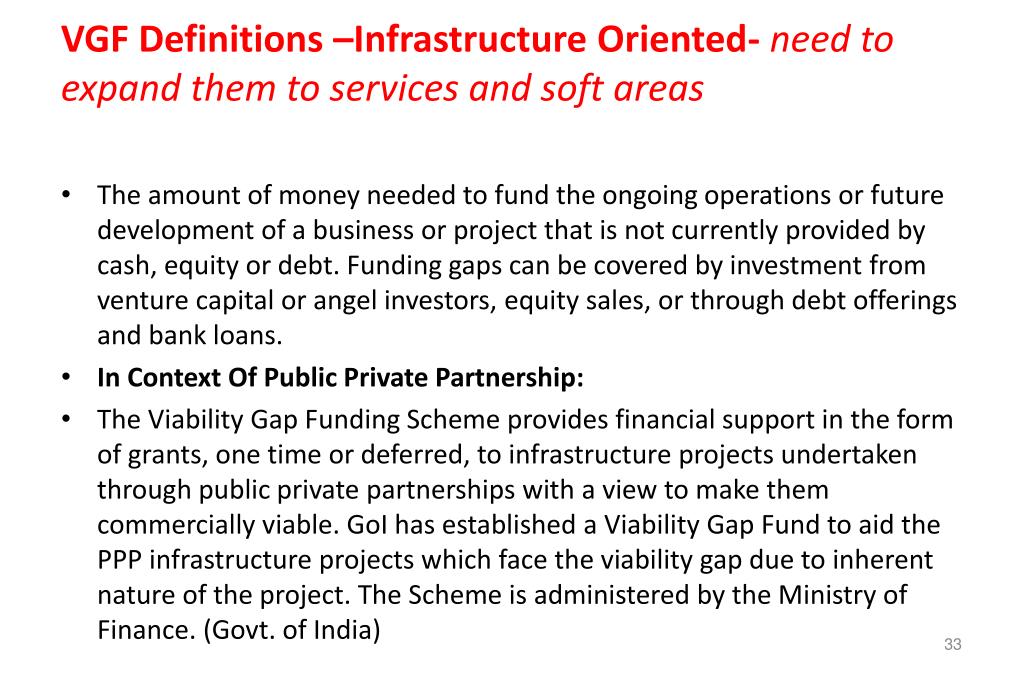 VGF Definitions –Infrastructure Oriented- need to expand them to services and soft areas • The amount of money needed to fund the ongoing operations or future development of a business or project that is not currently provided by cash, equity or debt. Funding gaps can be covered by investment from venture capital or angel investors, equity sales, or through debt offerings and bank loans. • In Context Of Public Private Partnership: • The Viability Gap Funding Scheme provides financial support in the form of grants, one time or deferred, to infrastructure projects undertaken through public private partnerships with a view to make them commercially viable. GoI has established a Viability Gap Fund to aid the PPP infrastructure projects which face the viability gap due to inherent nature of the project. The Scheme is administered by the Ministry of Finance. (Govt. of India)