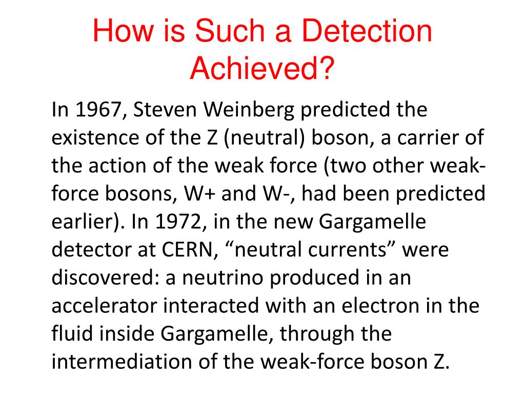 How is Such a Detection Achieved? In 1967, Steven Weinberg predicted the existence of the Z (neutral) boson, a carrier of the action of the weak force (two other weak-force bosons, W+ and W-, had been predicted earlier). In 1972, in the new Gargamelle detector at CERN, “neutral currents” were discovered: a neutrino produced in an accelerator interacted with an electron in the fluid inside Gargamelle, through the intermediation of the weak-force boson Z.