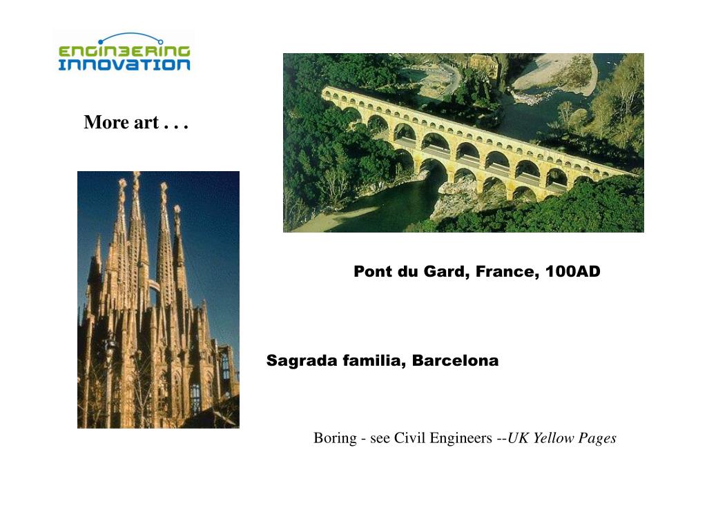 More art . . . Pont du Gard, France, 100AD Sagrada familia, Barcelona Boring - see Civil Engineers --UK Yellow Pages