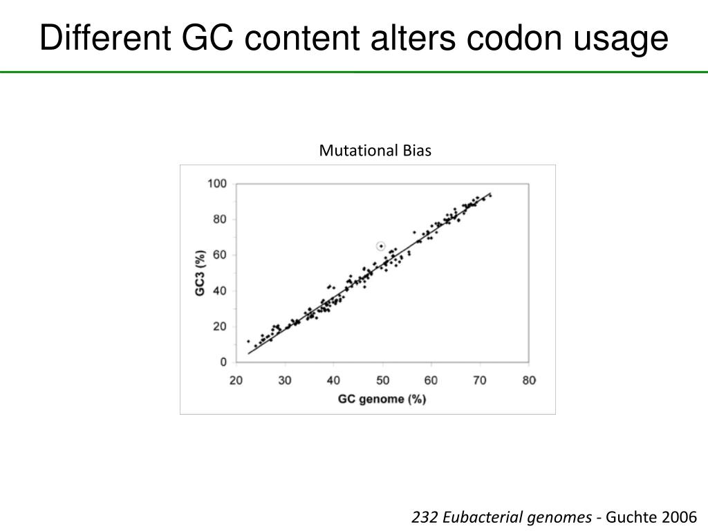 Different GC content alters codon usage Mutational Bias 232 Eubacterial genomes - Guchte 2006