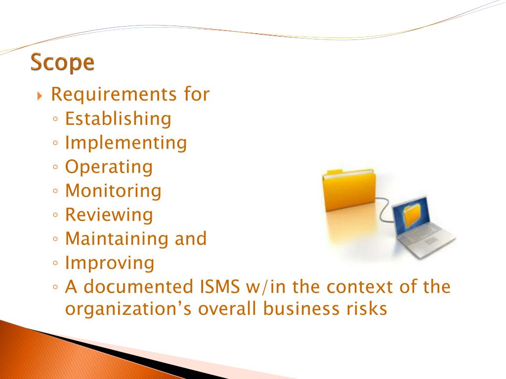 Scope • Requirements for • Establishing • Implementing • Operating • Monitoring • Reviewing • Maintaining and • Improving • A documented ISMS w/in the context of the organization’s overall business risks