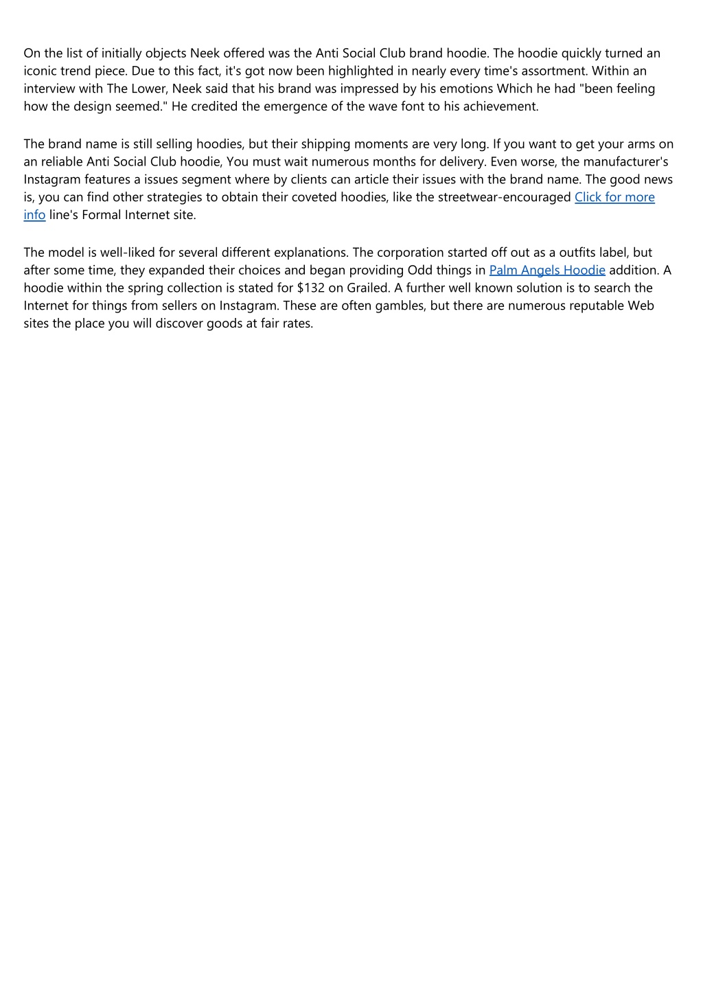 On the list of initially objects Neek offered was the Anti Social Club brand hoodie. The hoodie quickly turned an iconic trend piece. Due to this fact, it's got now been highlighted in nearly every time's assortment. Within an interview with The Lower, Neek said that his brand was impressed by his emotions Which he had "been feeling how the design seemed." He credited the emergence of the wave font to his achievement. The brand name is still selling hoodies, but their shipping moments are very long. If you want to get your arms on an reliable Anti Social Club hoodie, You must wait numerous months for delivery. Even worse, the manufacturer's Instagram features a issues segment where by clients can article their issues with the brand name. The good news is, you can find other strategies to obtain their coveted hoodies, like the streetwear-encouraged Click for more info line's Formal Internet site. The model is well-liked for several different explanations. The corporation started off out as a outfits label, but after some time, they expanded their choices and began providing Odd things in Palm Angels Hoodie addition. A hoodie within the spring collection is stated for $132 on Grailed. A further well known solution is to search the Internet for things from sellers on Instagram. These are often gambles, but there are numerous reputable Web sites the place you will discover goods at fair rates.